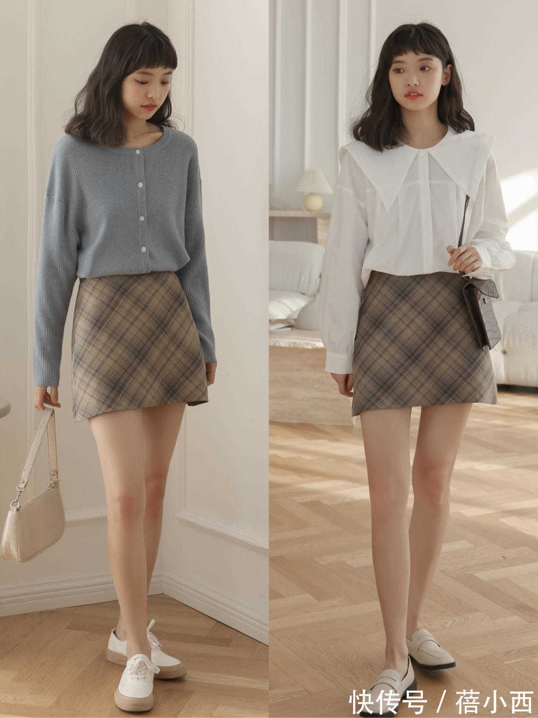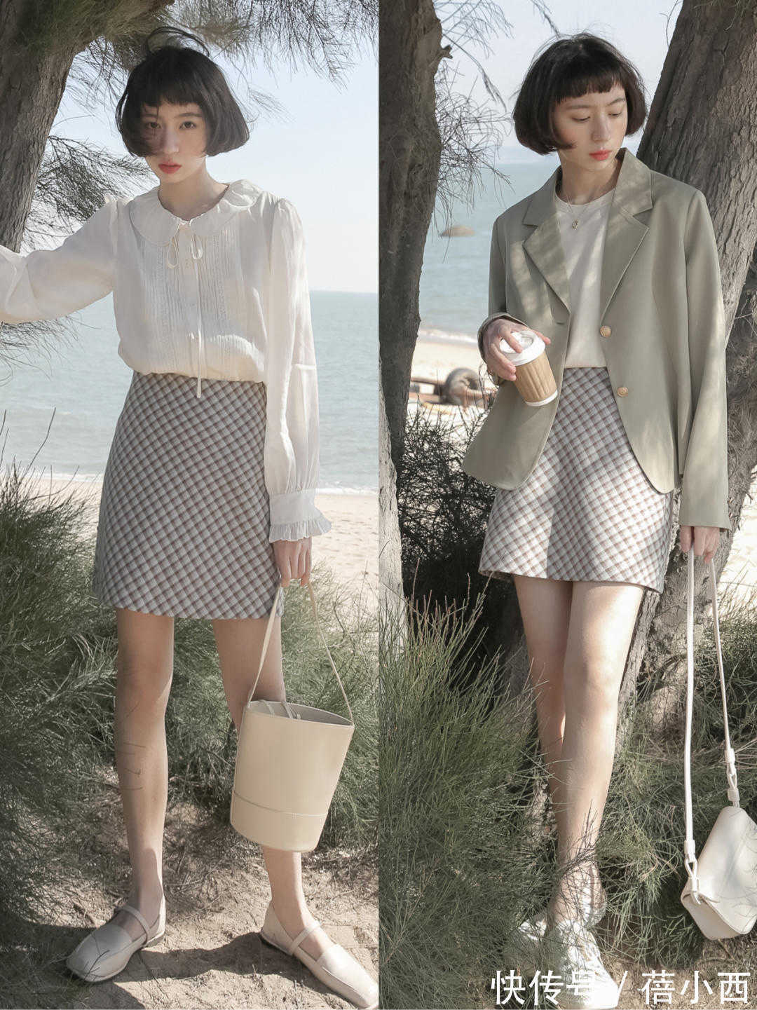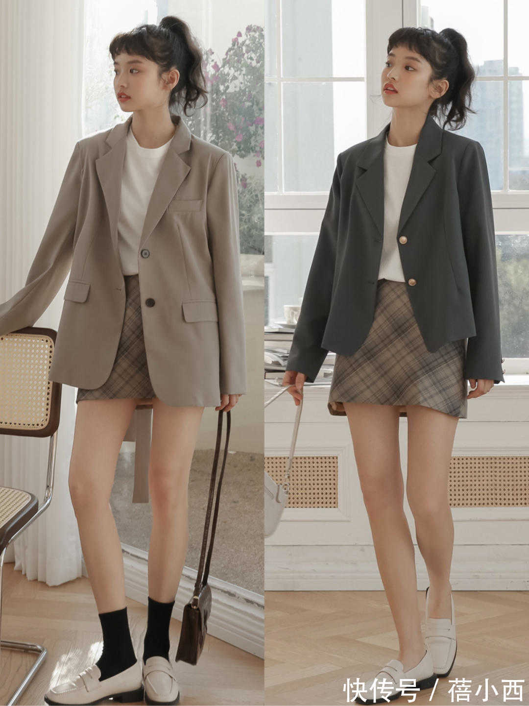 像下面这些博主,通过格纹半身裙凹造型,极大程度地修饰了身材比例。并且还可以结合西装来搭配,这样会显得更时尚,用一件宽松的西装搭配短格纹外身裙,毫不费力就能够凸显出时尚感。普通人也可以参考这样的穿搭,很优雅。